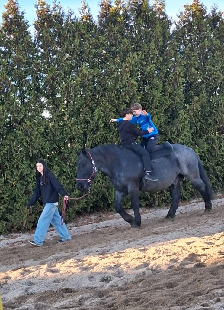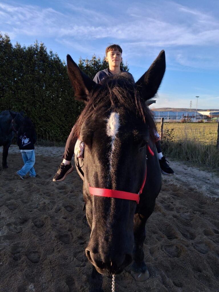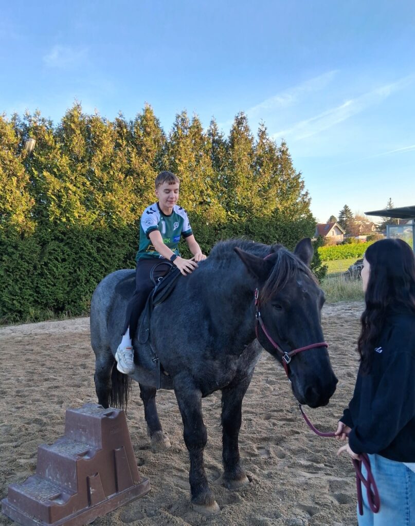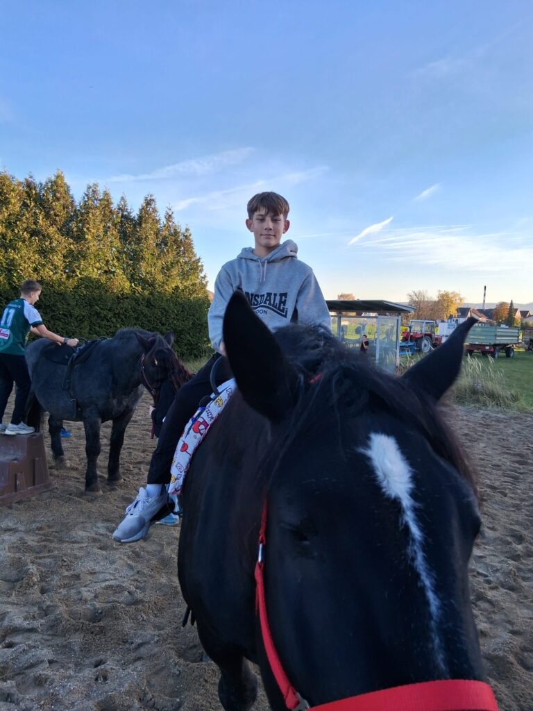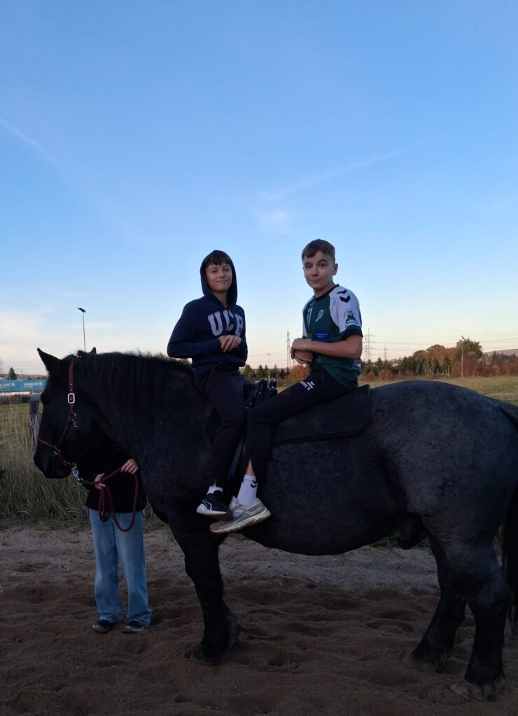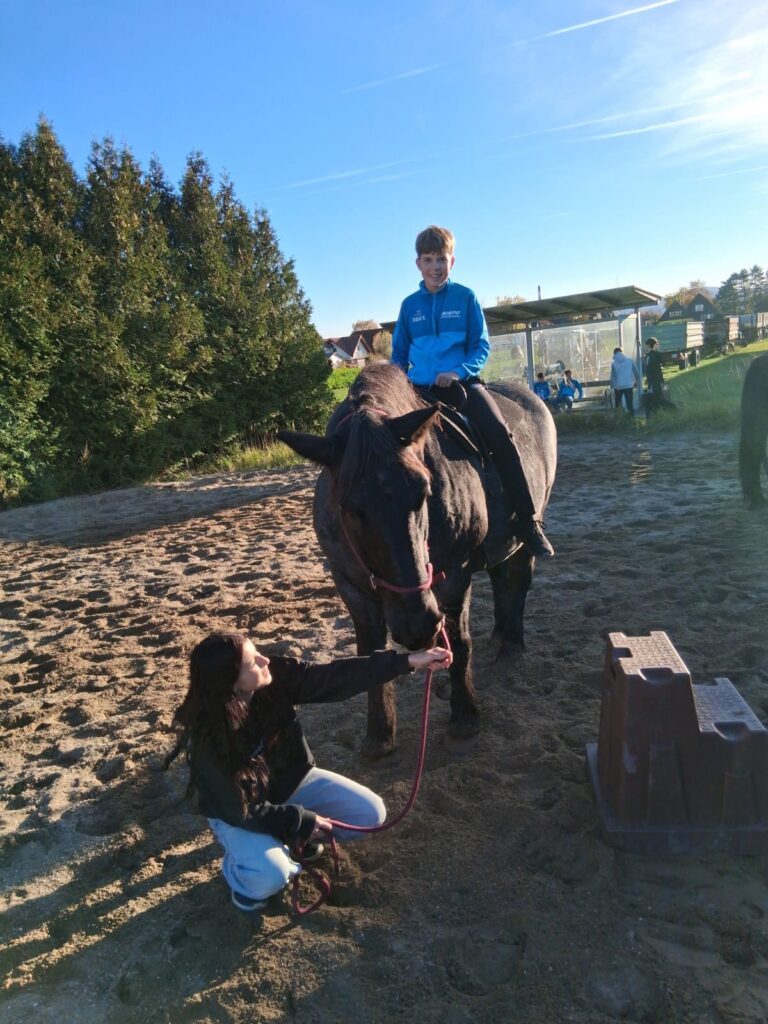 Die Elternvereinsobfrau und Klassenelternvertreterin der 4.b., Frau Springer Elisabeth, lud die Schüler*innen ihrer Klasse zu einem Nachmittag mit ihren Norikern auf den Reitplatz. Annemarie und Josefine fungierten tatkräftig als Helferinnen mit ihrer Erfahrung im Umgang mit Pferden. Unsere Burschen standen dieser Aufgabe vorab sehr skeptisch gegenüber, konnten aber von Frau Springer großartig motiviert werden und ließen sich schließlich auf die neue Herausforderung ein. Noriker sind in ihrer Größe (und Masse) nicht zu unterschätzen, flößen daher zunächst doch erheblichen Respekt ein. Dennoch saßen alle Kinder alleine oder auch zu zweit auf jedem der drei Tiere und selbst kleine Kunststücke waren am Ende kein Thema mehr.