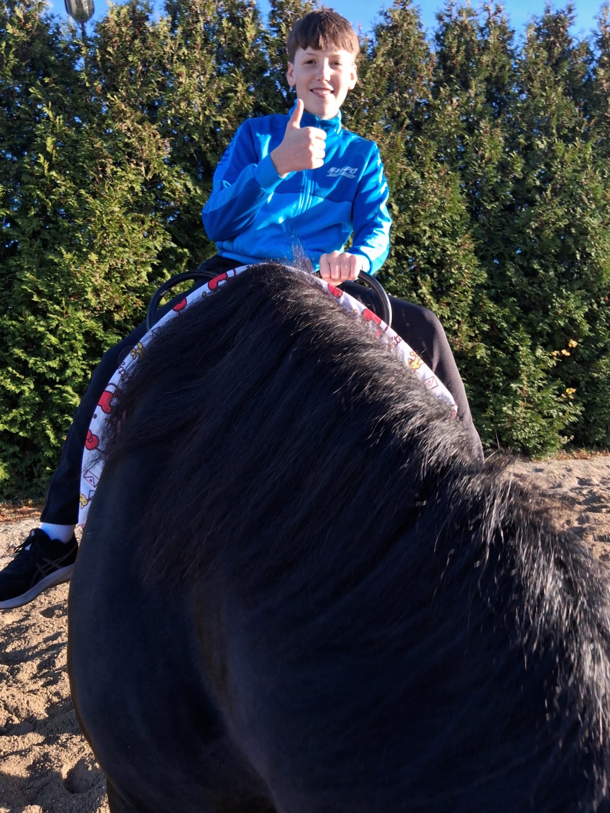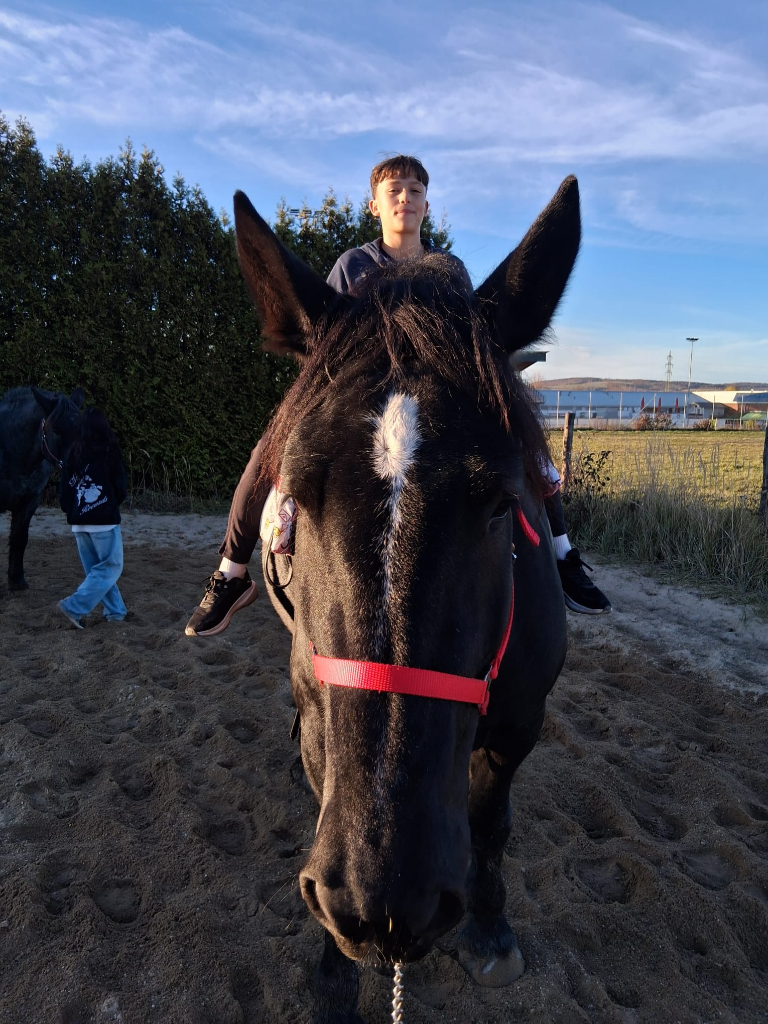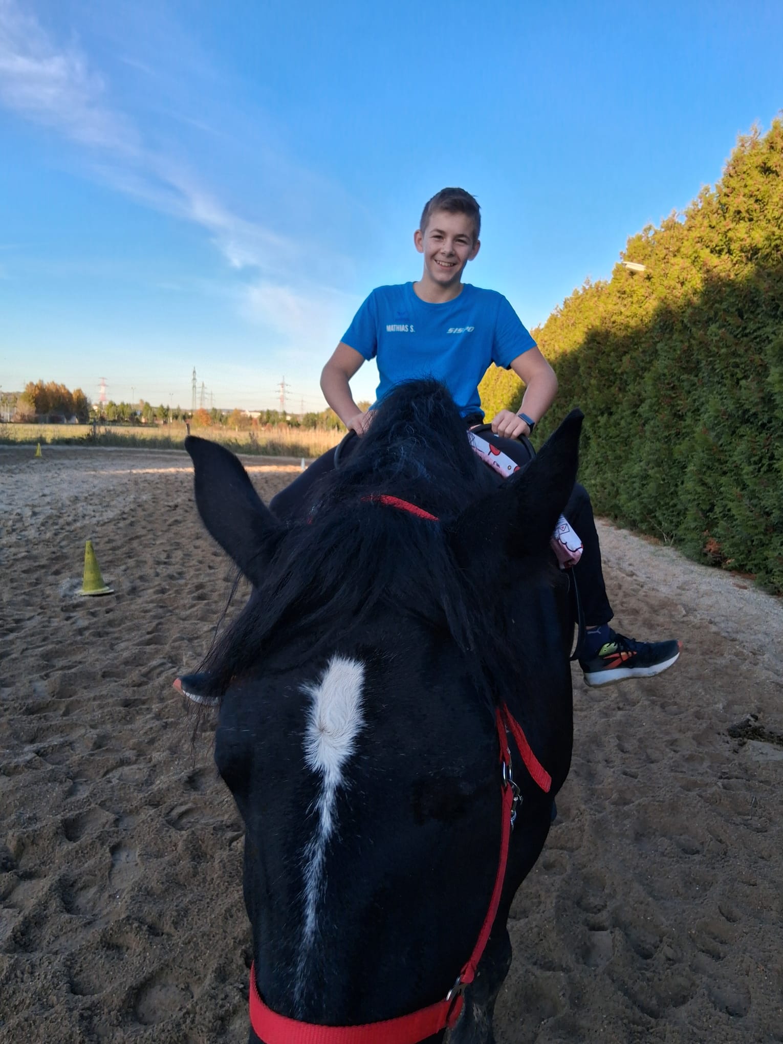 Die Elternvereinsobfrau und Klassenelternvertreterin der 4.b., Frau Springer Elisabeth, lud die Schüler*innen ihrer Klasse zu einem Nachmittag mit ihren Norikern auf den Reitplatz. Annemarie und Josefine fungierten tatkräftig als Helferinnen mit ihrer Erfahrung im Umgang mit Pferden. Unsere Burschen standen dieser Aufgabe vorab sehr skeptisch gegenüber, konnten aber von Frau Springer großartig motiviert werden und ließen sich schließlich auf die neue Herausforderung ein. Noriker sind in ihrer Größe (und Masse) nicht zu unterschätzen, flößen daher zunächst doch erheblichen Respekt ein. Dennoch saßen alle Kinder alleine oder auch zu zweit auf jedem der drei Tiere und selbst kleine Kunststücke waren am Ende kein Thema mehr.